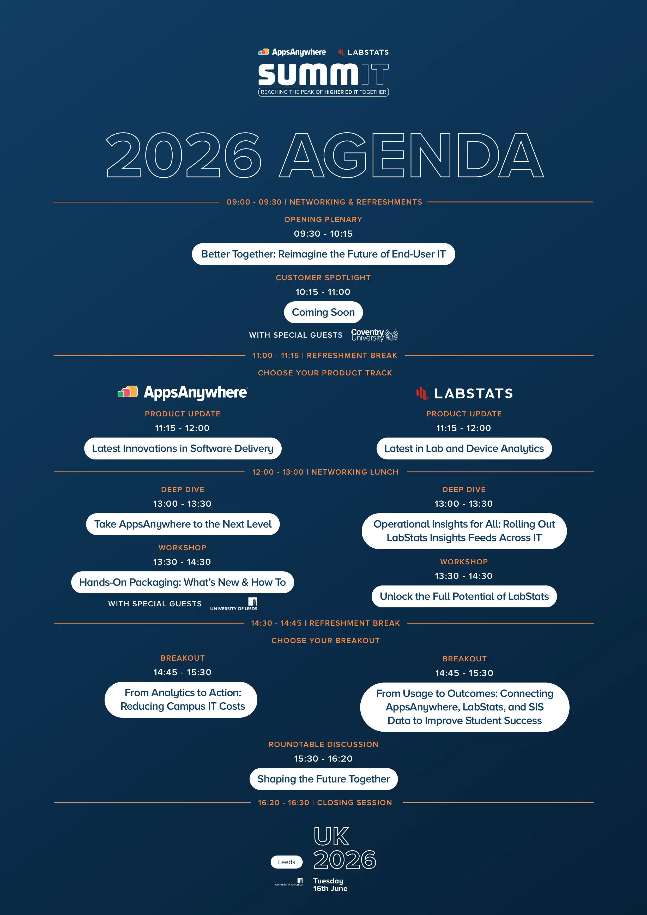 For the first time, The SUMMIT Series will be jointly hosted by AppsAnywhere and LabStats. With expertise spanning both software delivery and hardware utilisation analytics, this year’s event provides a richer, more comprehensive exploration of the end‑user computing ecosystem than ever before.